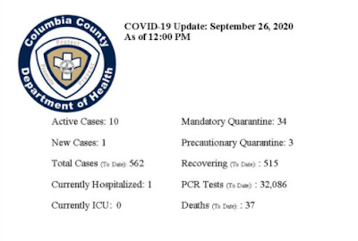 The Columbia County Department of Health has released its numbers for today. Since yesterday, there has been one new case of COVID-19 and no new recoveries, increasing the number of active cases by one to ten. One of the ten active cases is hospitalized. There are four more county residents in mandatory quarantine today than there were yesterday, but the number in precautionary quarantine remains the same. It has now been 109 consecutive days since there has been a death from COVID-19 in Columbia County.